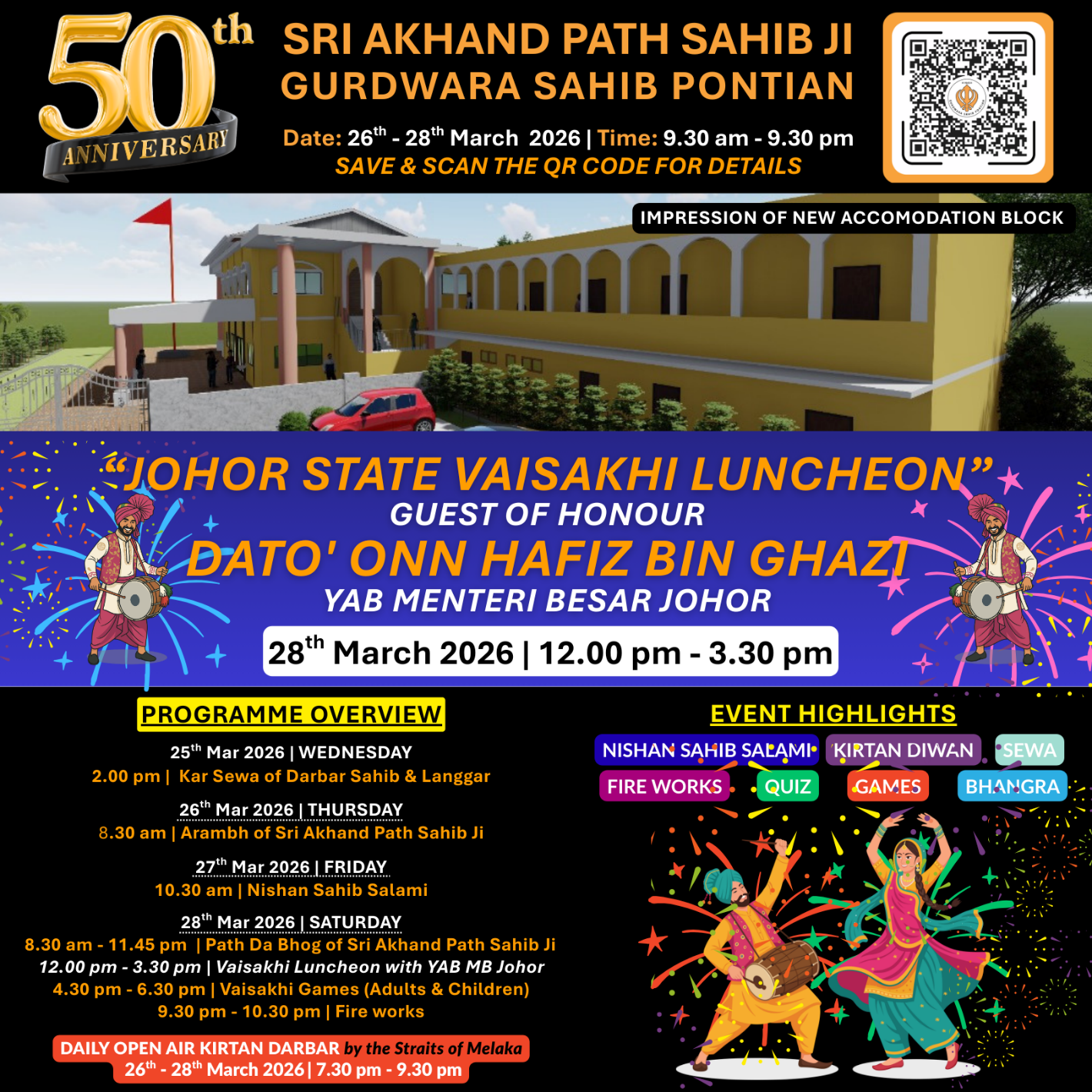 This year Gurdwara Sahib Pontian is honoured to have been given the opportunity to host the Johor State Vaisakhi Luncheon Celebration, and YAB Menteri Besar of Johor, Dato' Onn Hafiz Bin Ghazi, will be the Guest of Honour, signifying the importance of this celebration to both the Johor Sikh community and in line with the State's vision of Bangsa Johor. Johor has been doing this State Vaisakhi events for the past few years and are grateful to YBhg Dato' Avinderjit Singh for bringing this change in direction. The Gurdwaras and Sikh Non-Government Organisations in Johor are part of this initiative, and have made great progress, by working in unison.